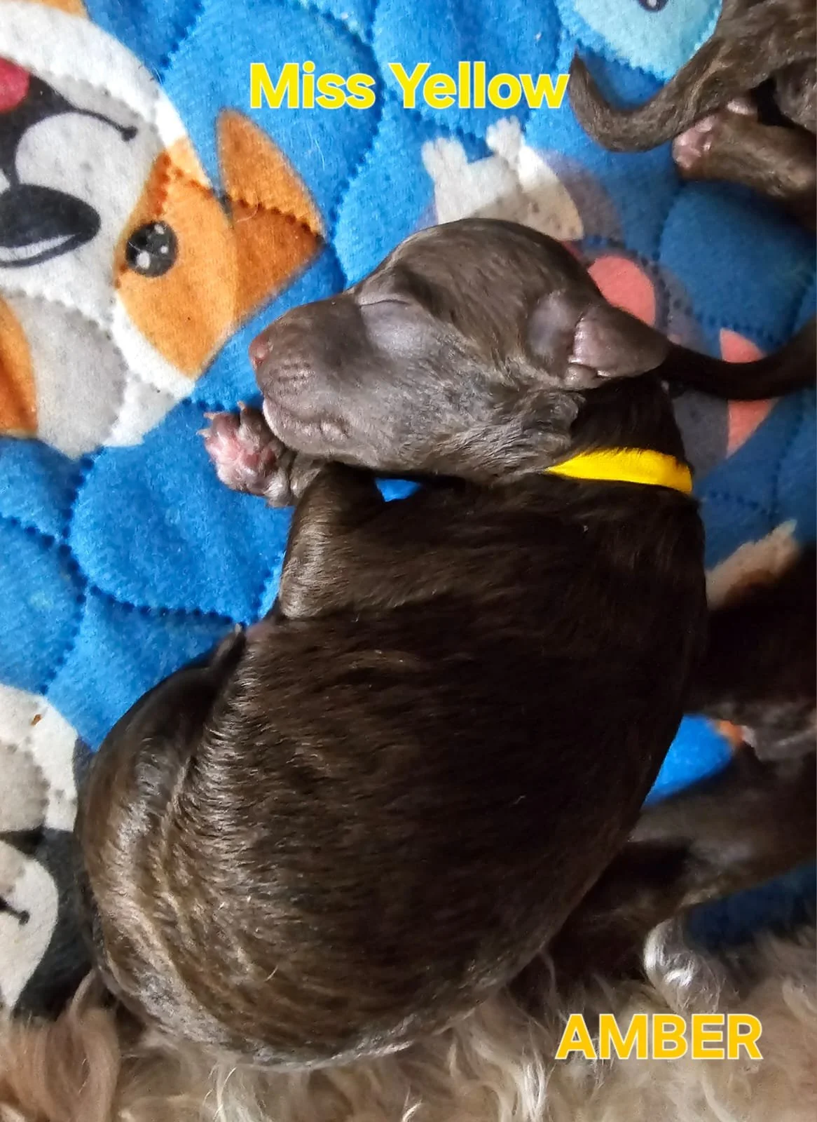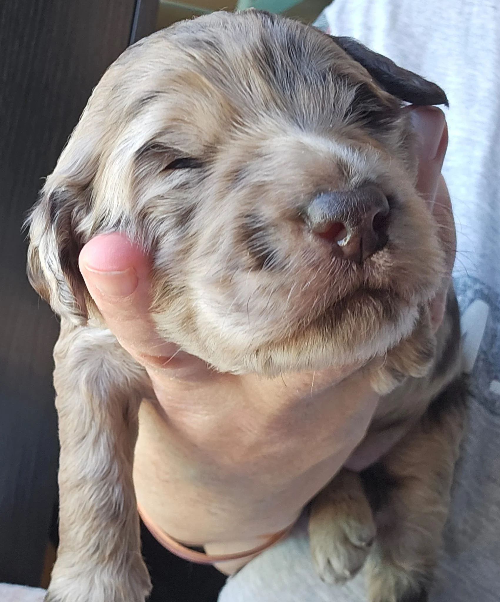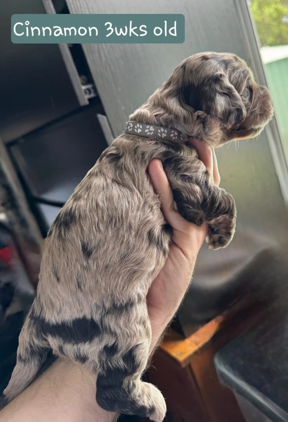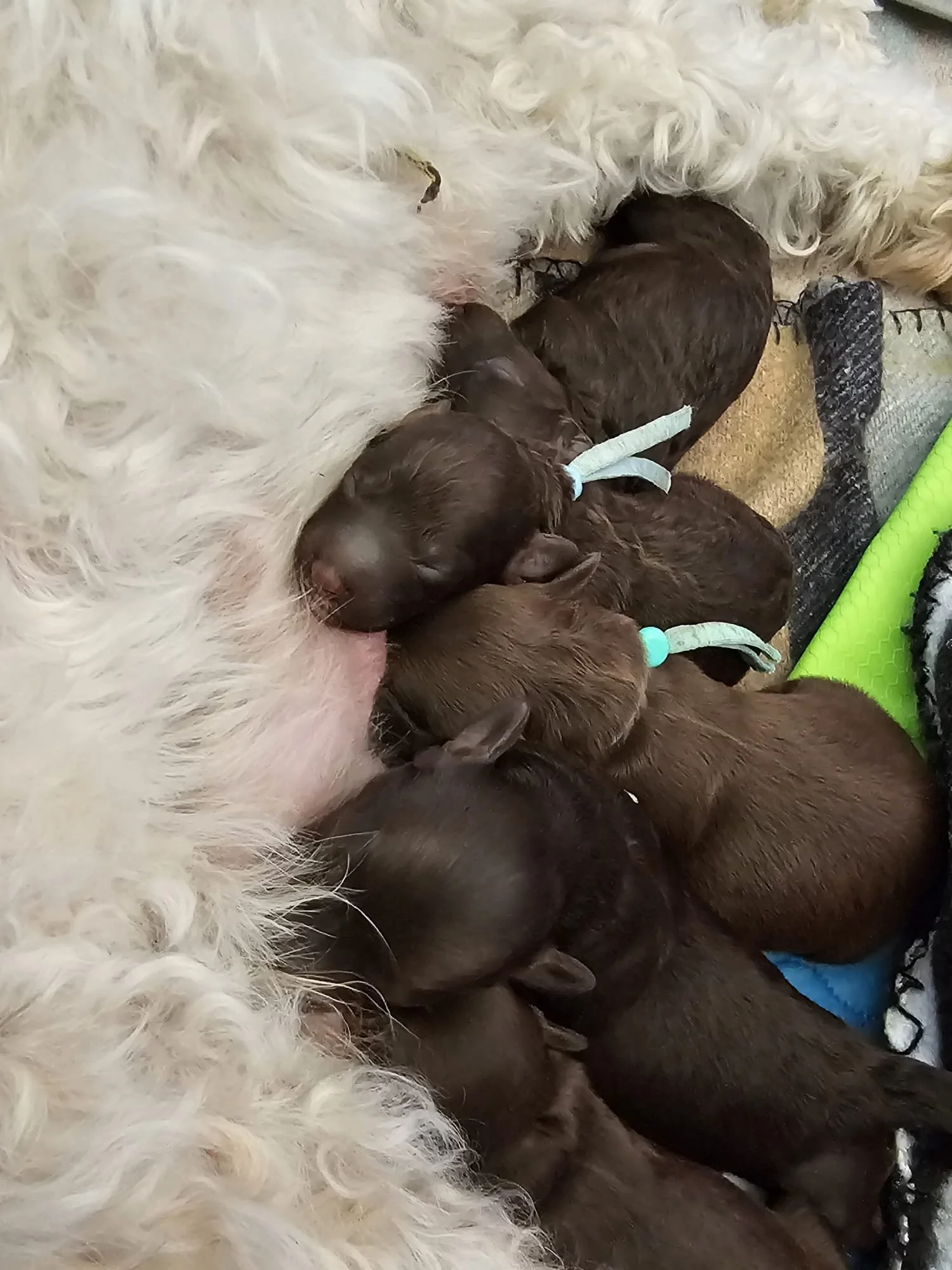 Daisy gave birth to 6 healthy robust pups. 3 chocolate with brown highlights. 3 Merle dappling. 2 boys 3 girls