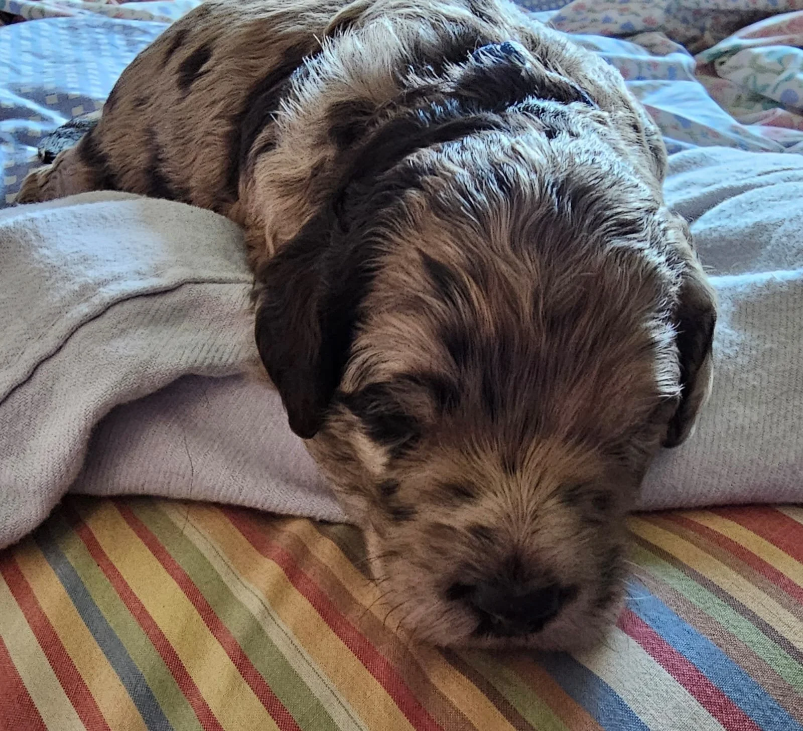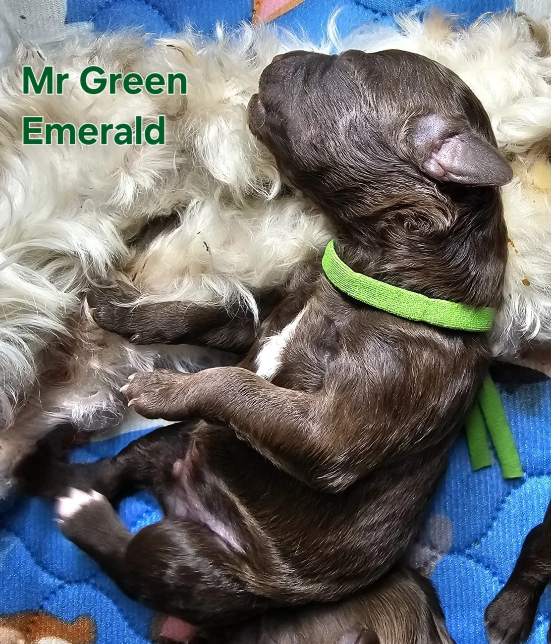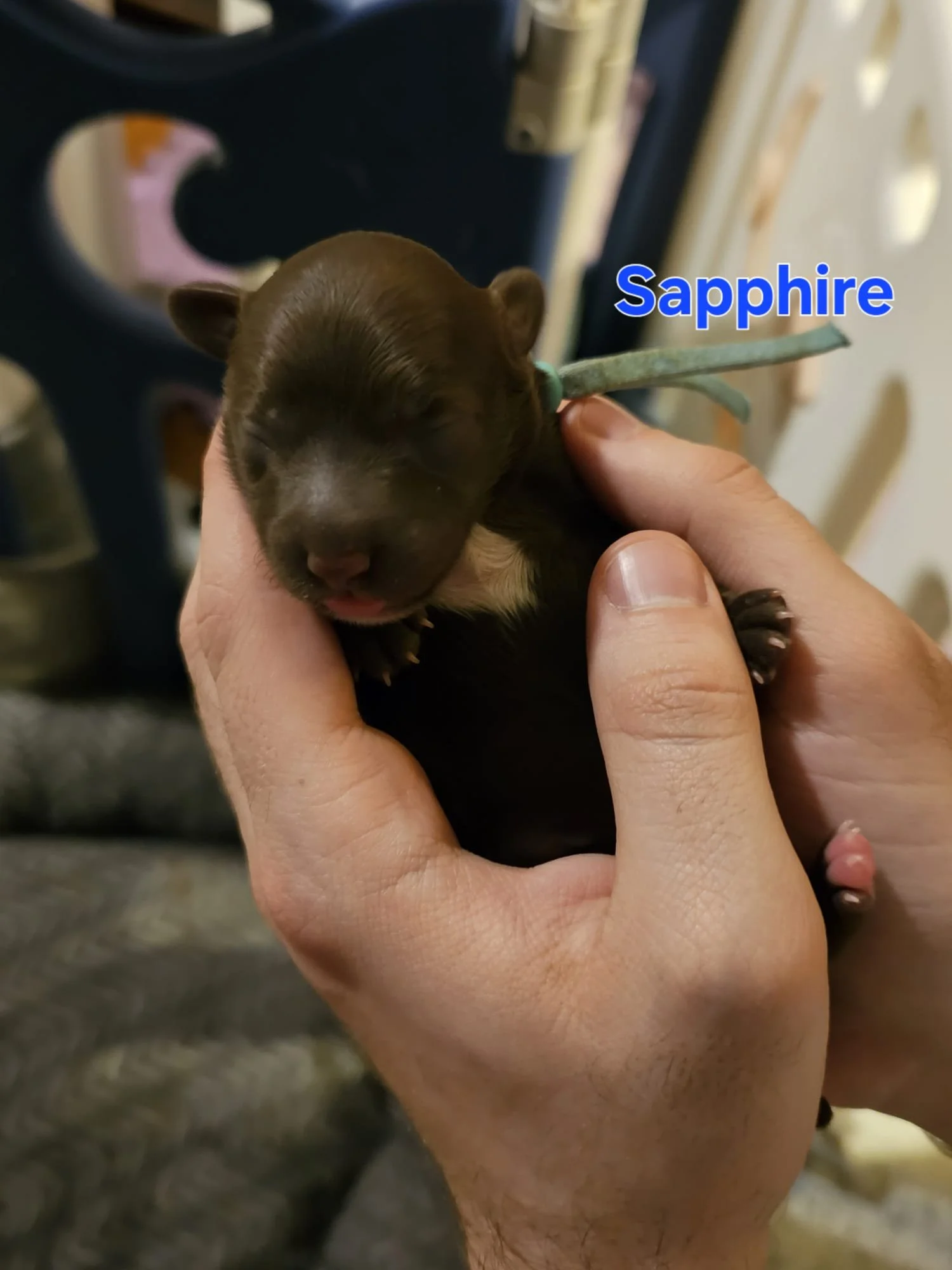 Daisy gave birth to 6 healthy robust pups. 3 chocolate with brown highlights. 3 Merle dappling. 2 boys 3 girls